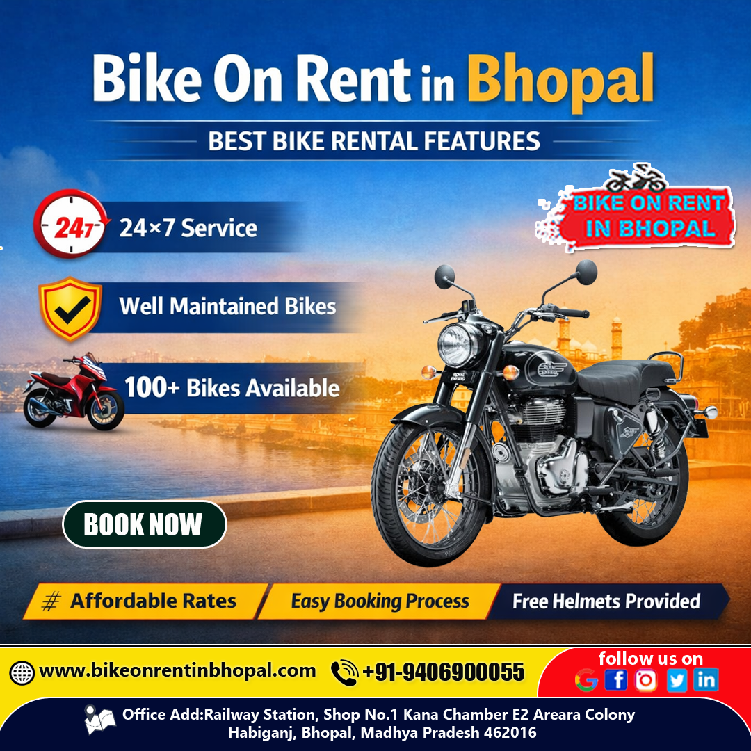 Sun Travels Bhopal offers convenient and affordable bike rental services in Bhopal, perfect for local city rides or trips to nearby towns like Sehore. Their fleet includes well-maintained bikes and scooties, ensuring smooth rides, fuel efficiency, and safety. Whether you need a two-wheeler for daily commuting, leisure travel, or a weekend getaway to Sehore, Sun Travels Bhopal provides reliable options to suit every requirement. Each vehicle is regularly serviced, clean, and ready for long or short trips. With flexible rental plans, transparent pricing, and professional 24/7 support, Sun Travels Bhopal makes exploring Bhopal and its surroundings simple, comfortable, and budget-friendly for all travelers.